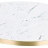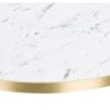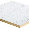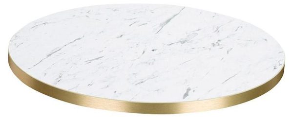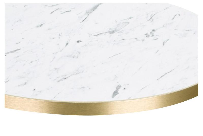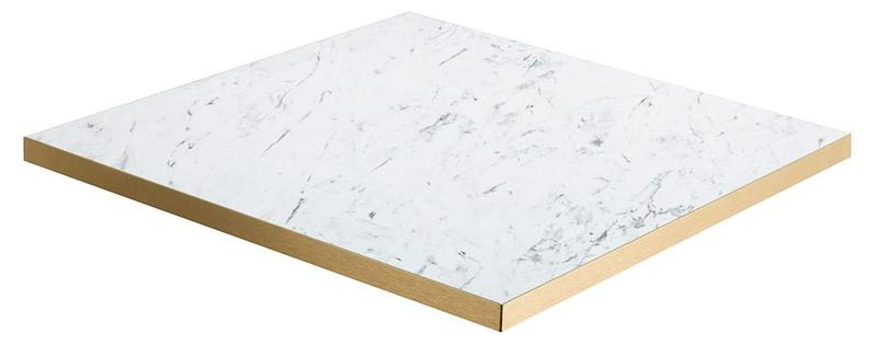 White Carrara Laminate table top with 25mm gold ABS edge. Available in a wide variety of standard sizes or bespoke made to specification.